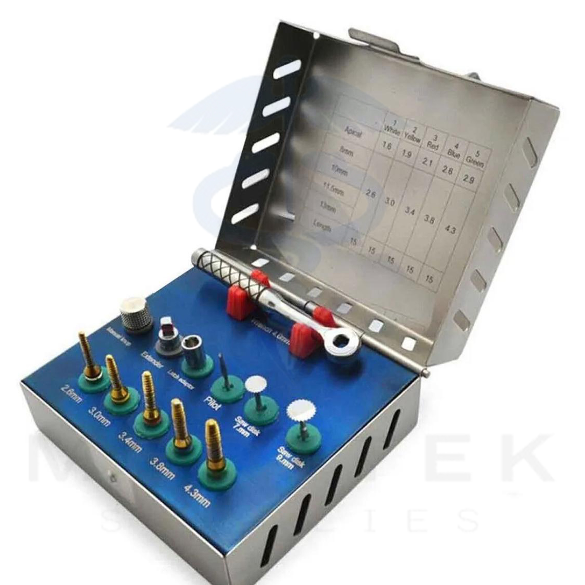 • 5 Long Trephine Drills (sizes: 4.0mm, 5.0mm, 6.0mm, 7.0mm, 8.0mm)