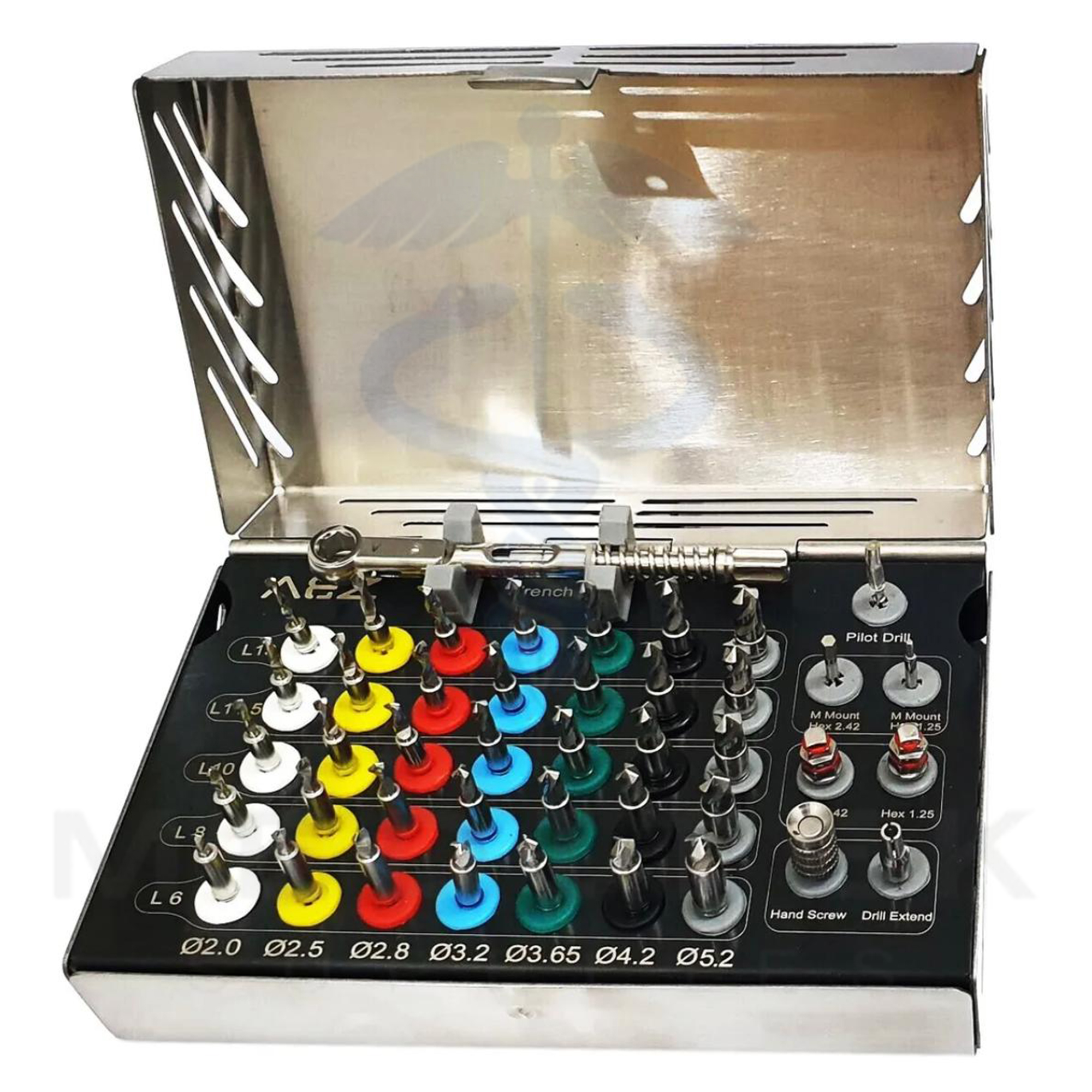 With 7 drill diameters and 5 stopper lengths, it supports a wide range of implant procedures. The color-coded rings allow quick size identification, while external irrigation compatibility ensures efficient cooling during use. Designed for comfort and reliability, this kit includes essential accessories such as motor mounts, ratchet drivers, a drill extender, and a torque wrench, making it a complete clinical solution.